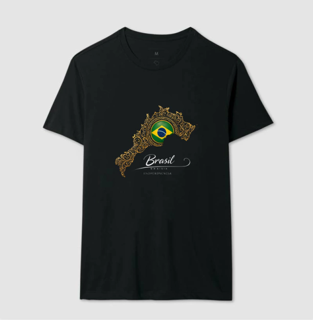Celebre o orgulho brasileiro com a incrível Camiseta Brasil Independência. Com um design exclusivo, esta peça apresenta um elegante contorno do mapa do Brasil adornado por detalhes ornamentados em dourado, com a bandeira nacional destacada no centro.